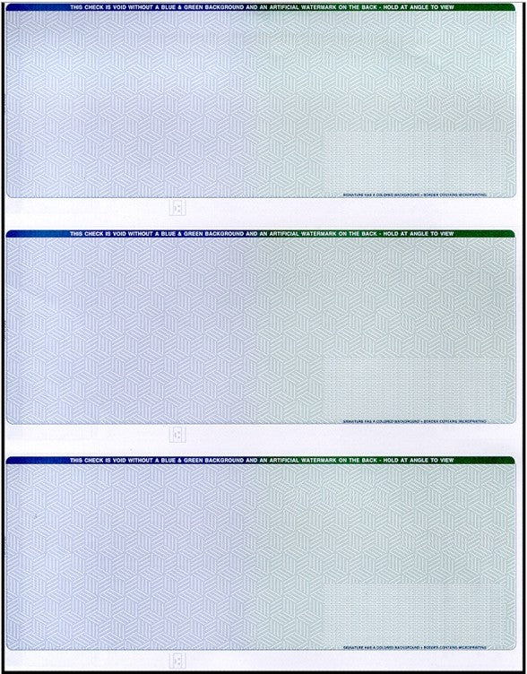 3 PER PAGE SECURITY BUSINESS CHECKS - BLANK LASER VOUCHER CHECKS - SUPER SECURE CHECKS (NO STUB) PREMIUM SECURITY CHECKS (BLUE GREEN) - 500/PACK